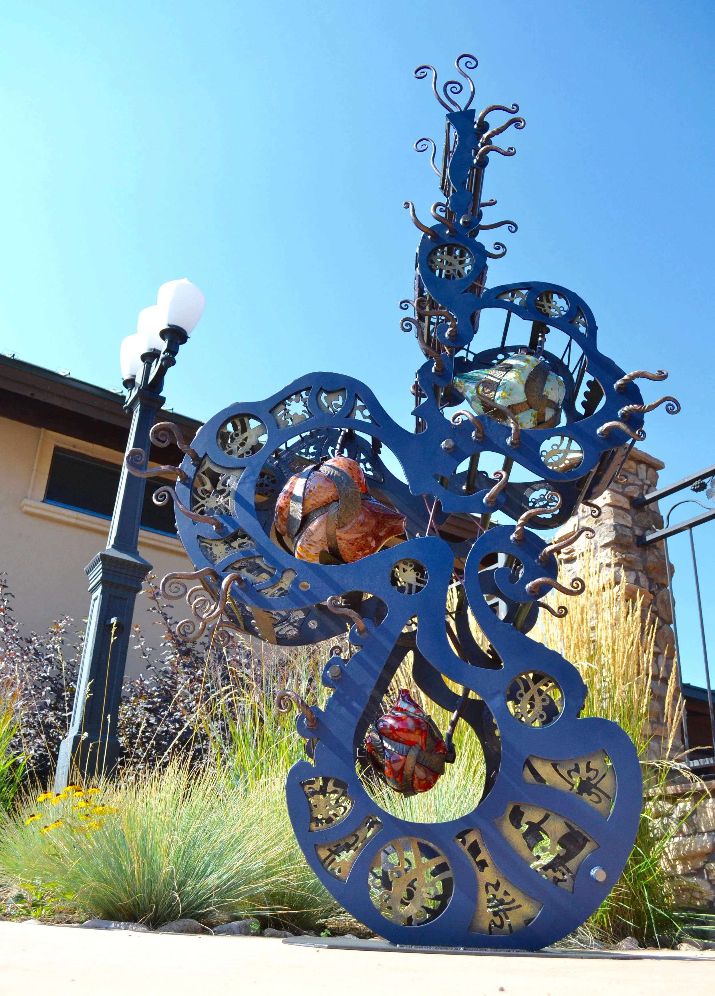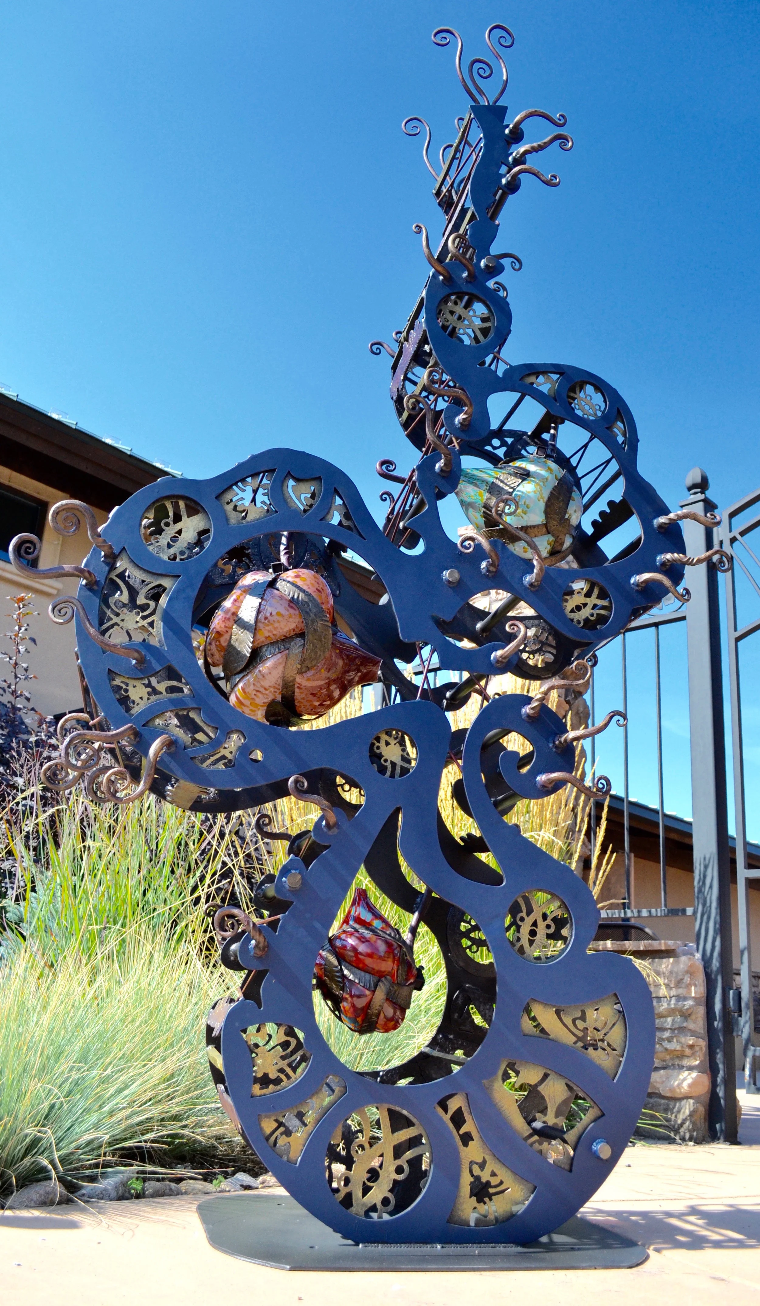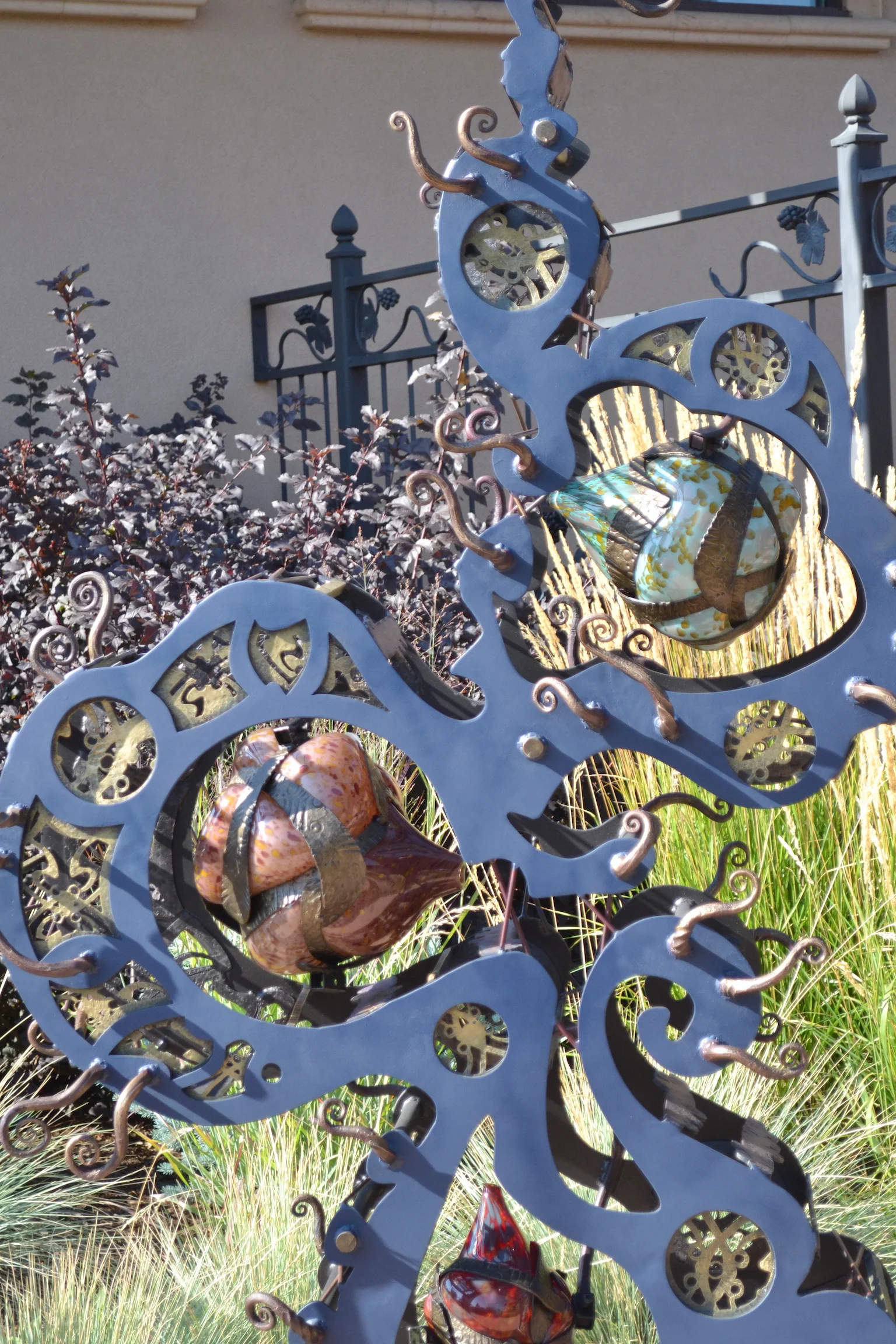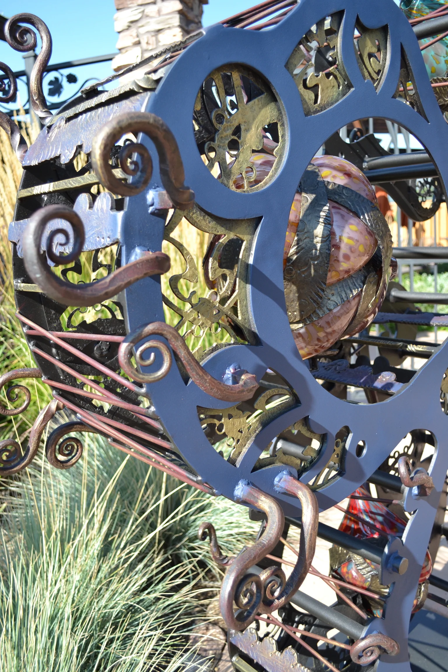 modern wrought-iron style metal and glass art, sculpture, and custom decor