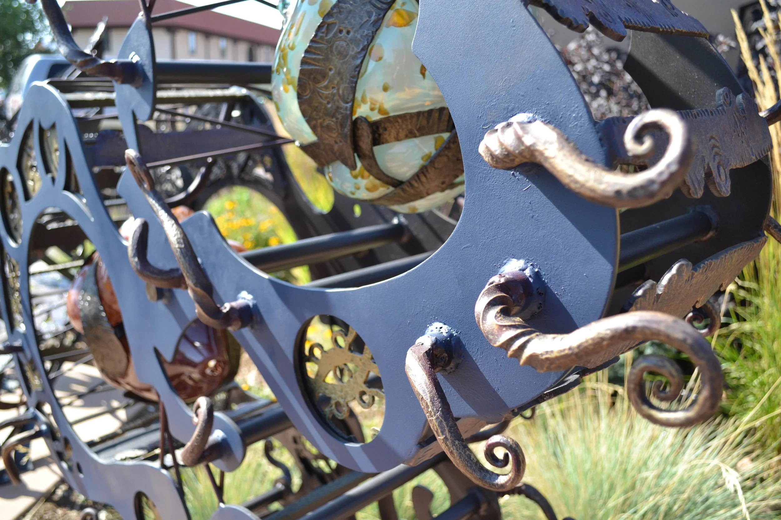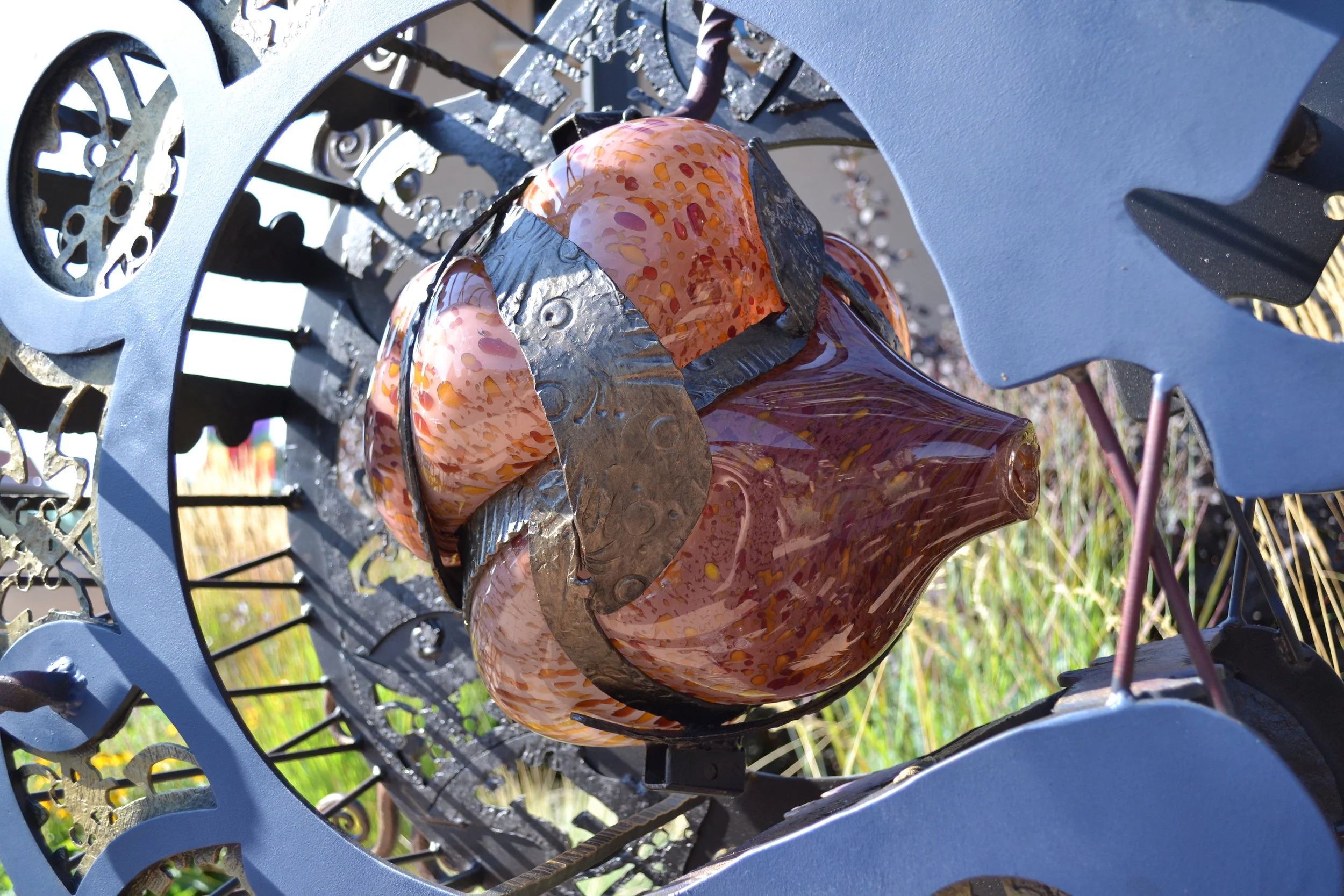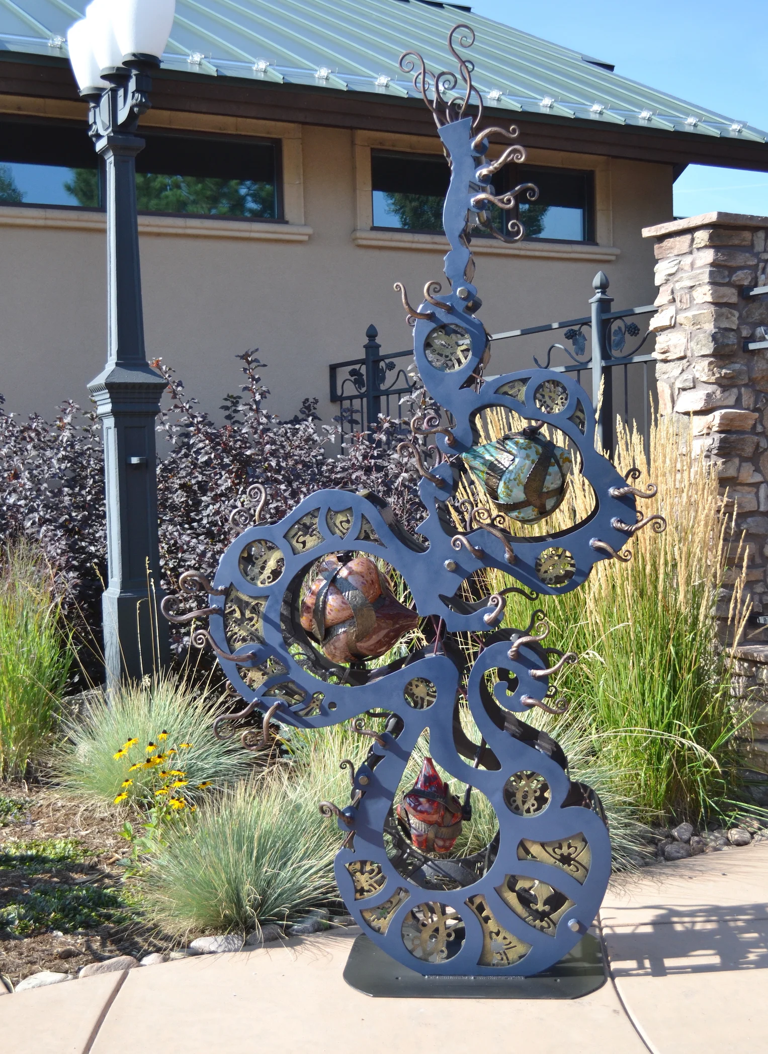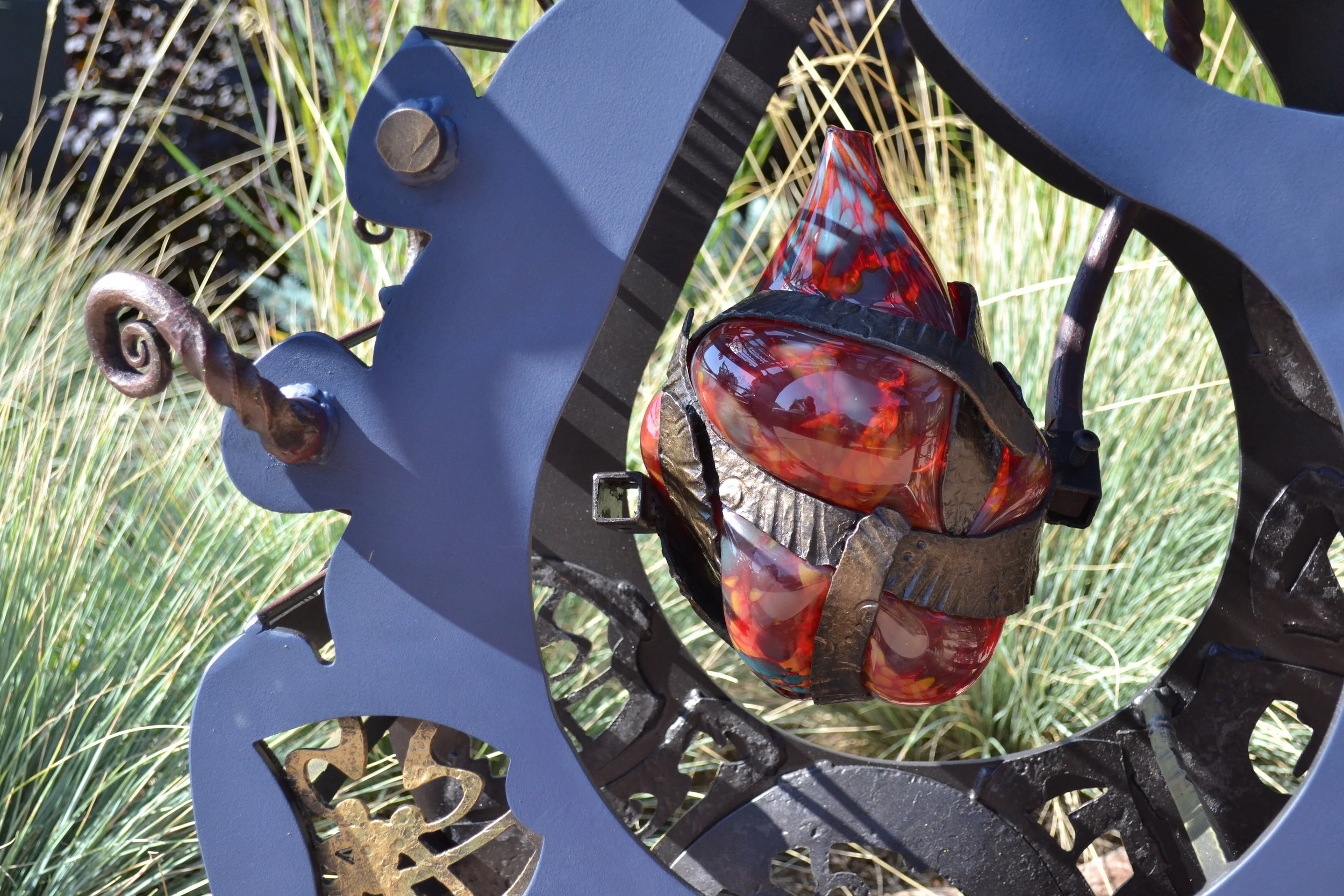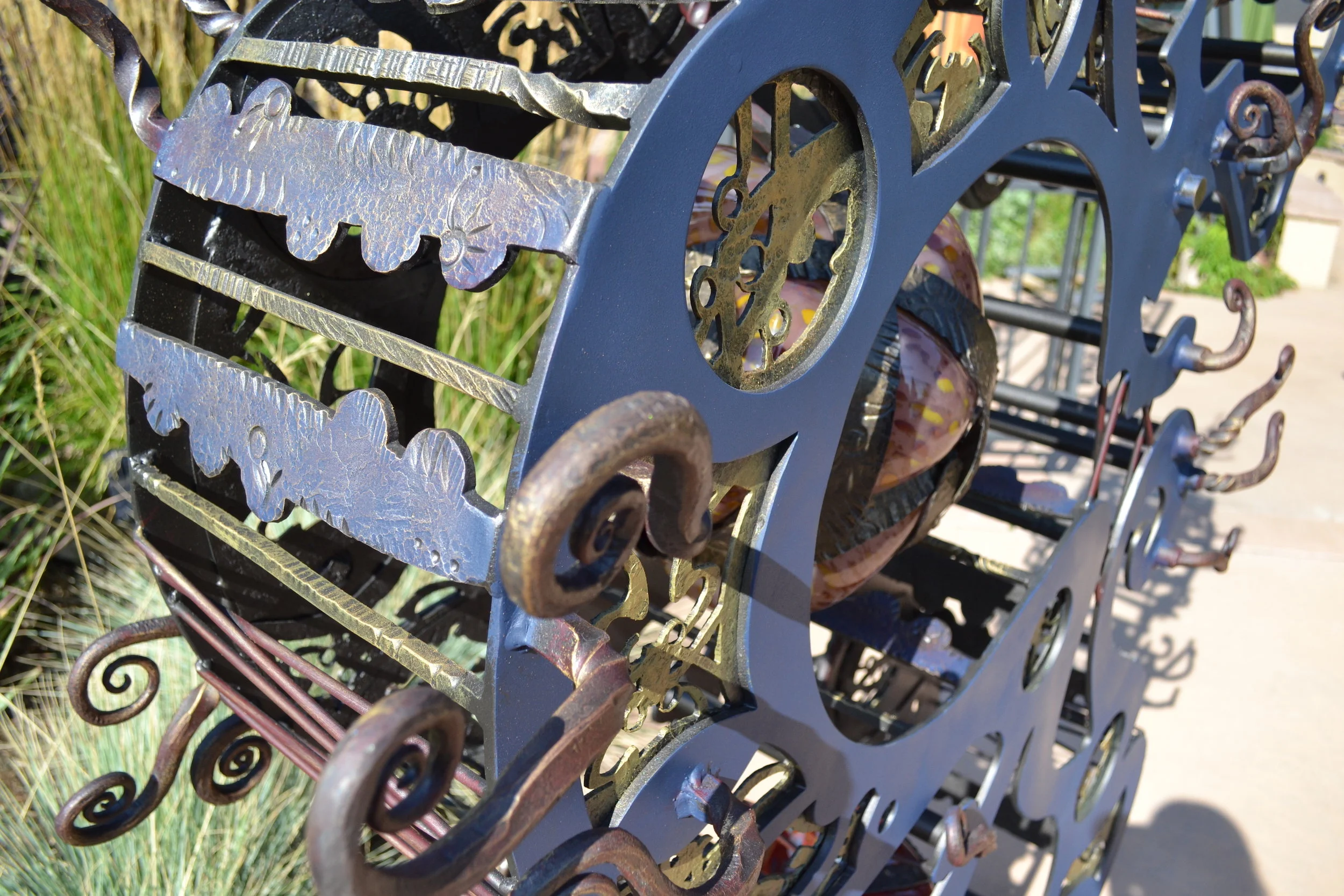 modern wrought-iron style metal and glass art, sculpture, and custom decor