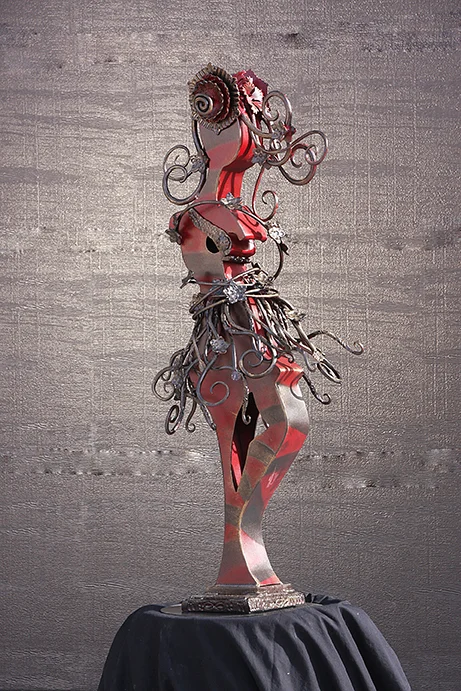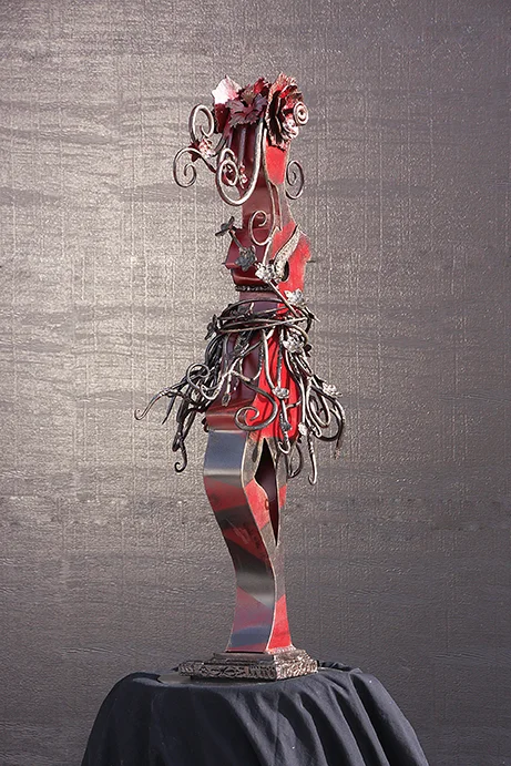 Sanguine is part of my "Iron & Lace" series which is made up of strong women from all avenues of the world. I begin with a simple gesture, cut out of mild steel sheet, then add hand forged steel adornment to bring out the essence her character, that which makes her worthy of celebration