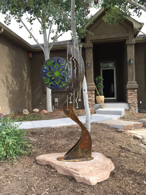 modern wrought-iron style metal and glass art, sculpture, and custom decor