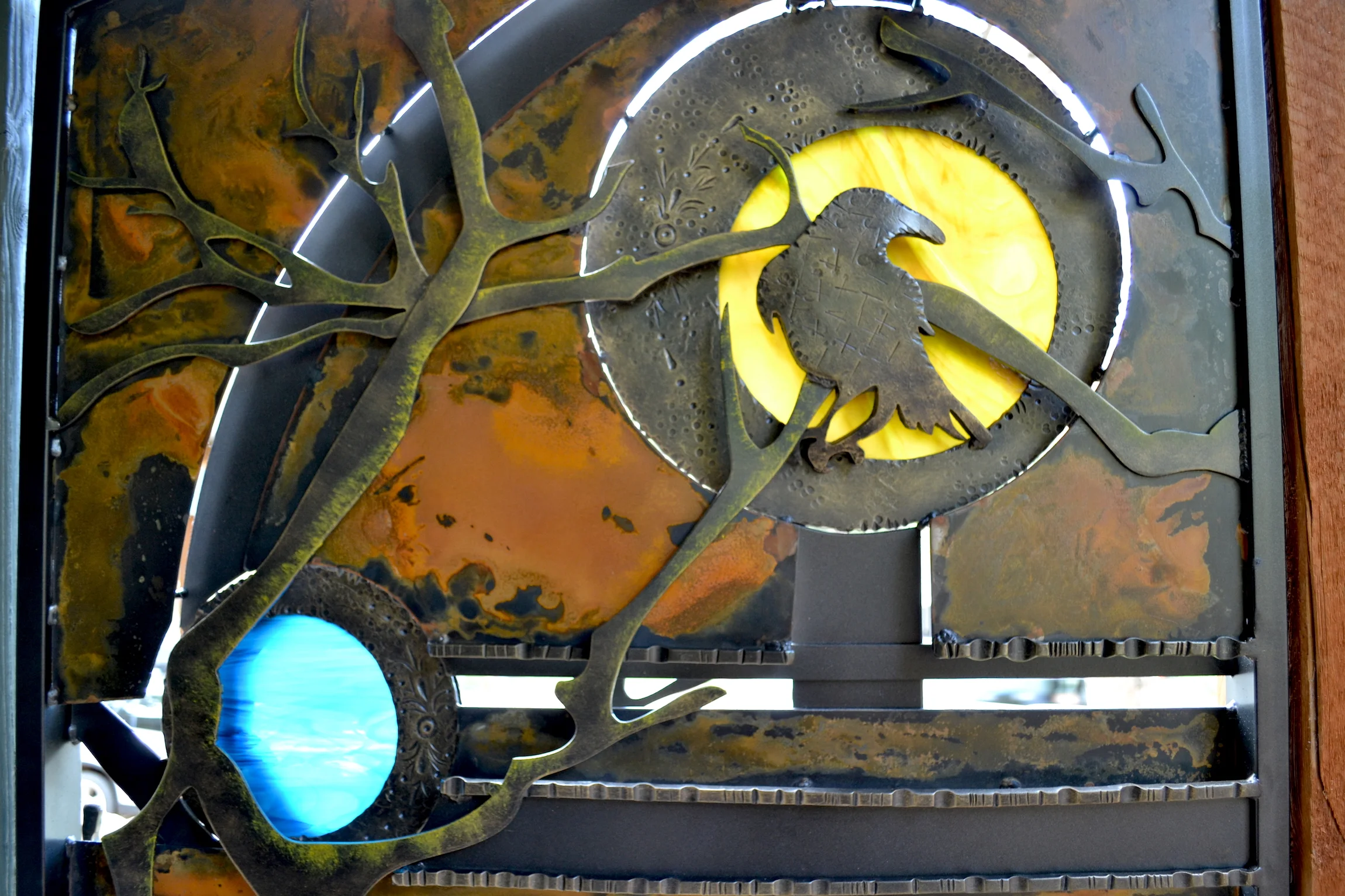modern wrought-iron style metal and glass art, sculpture, and custom decor