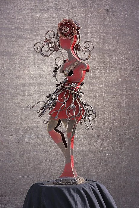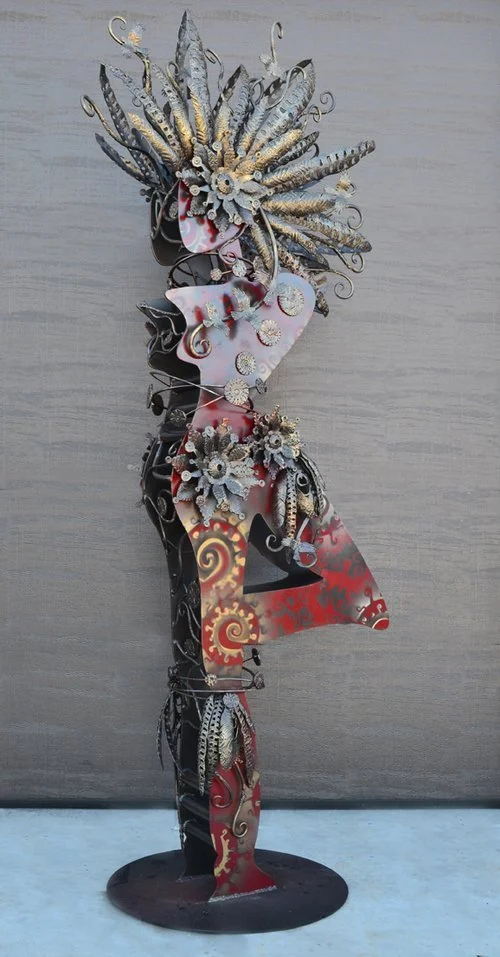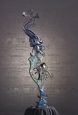 modern wrought-iron style metal and glass art, sculpture, and custom decor