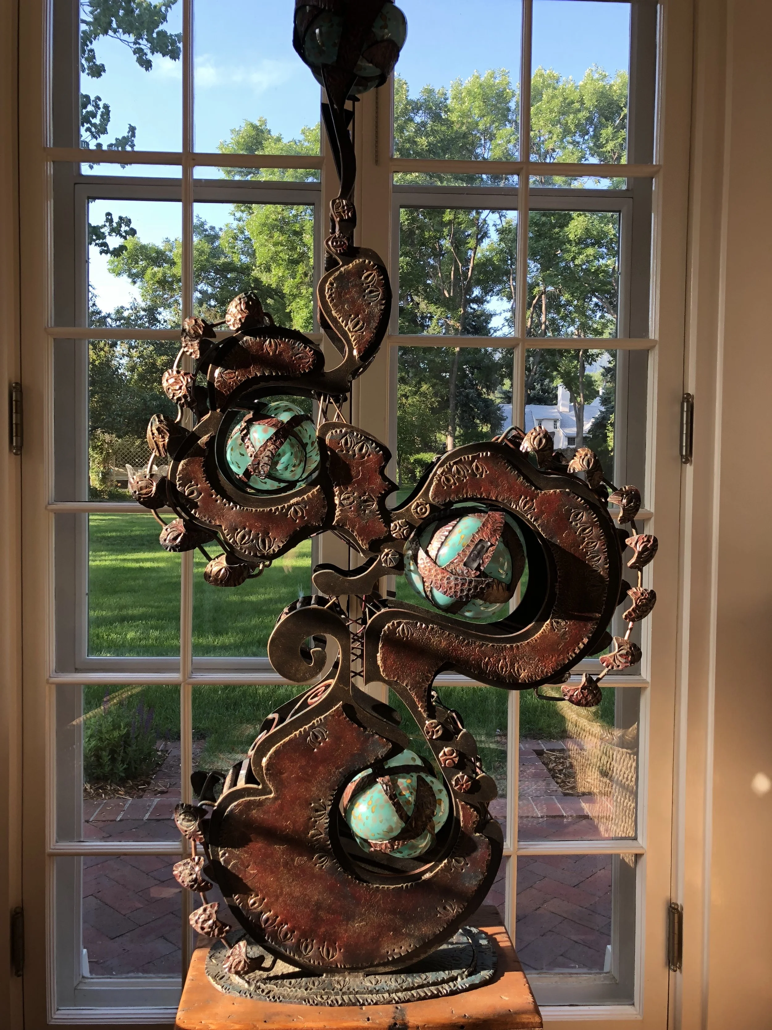 modern wrought-iron style metal and glass art, sculpture, and custom decor