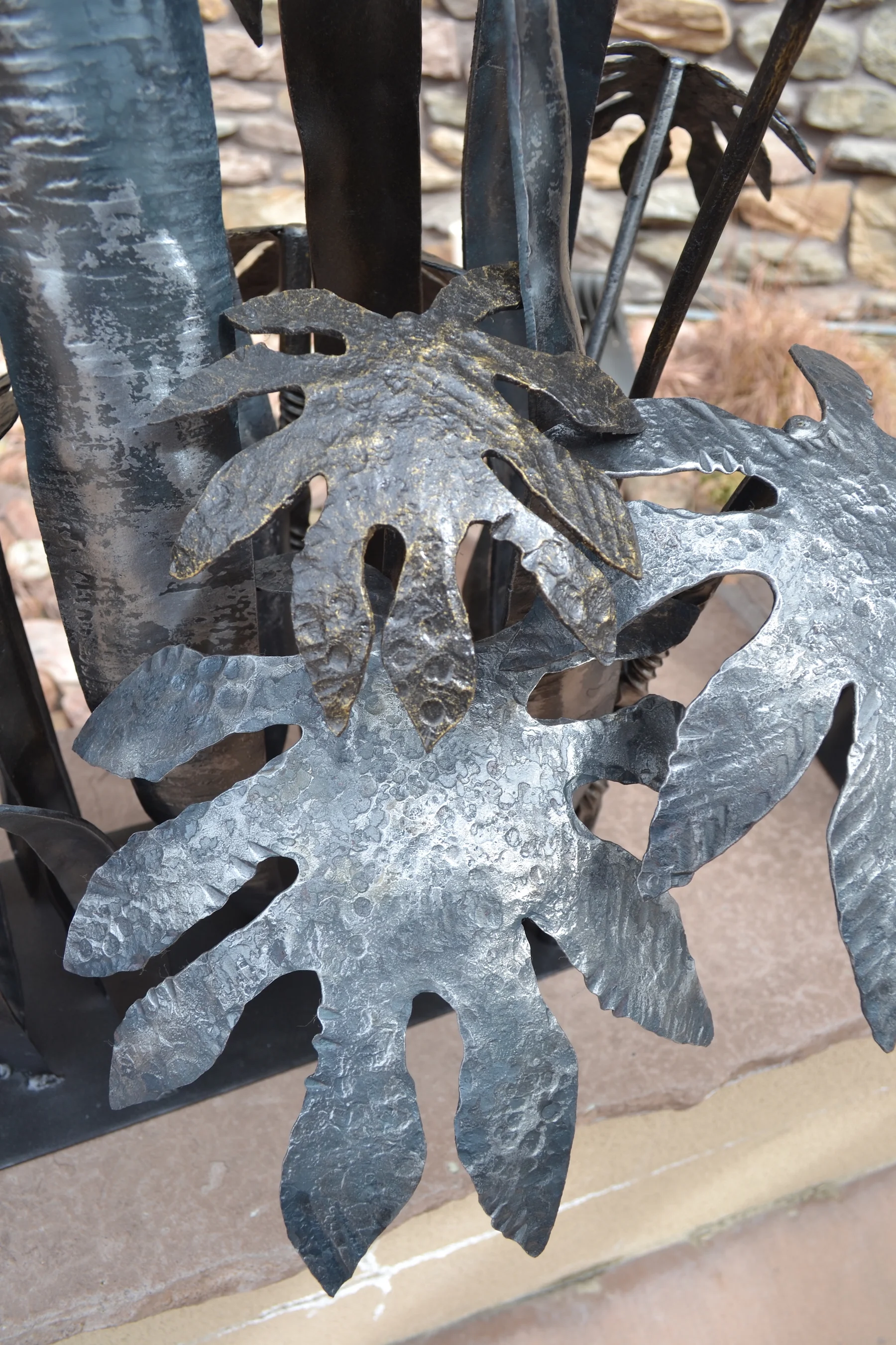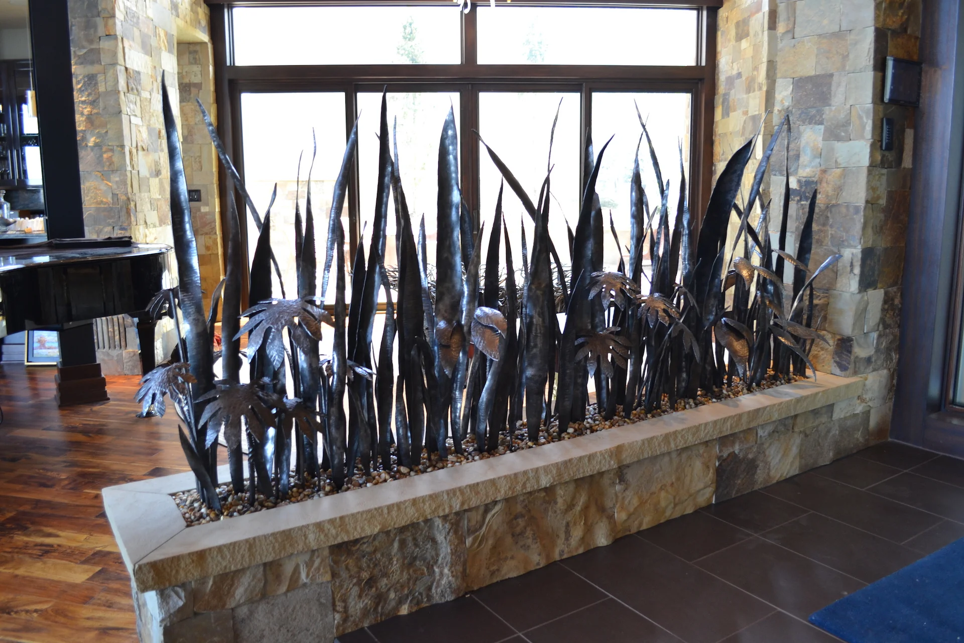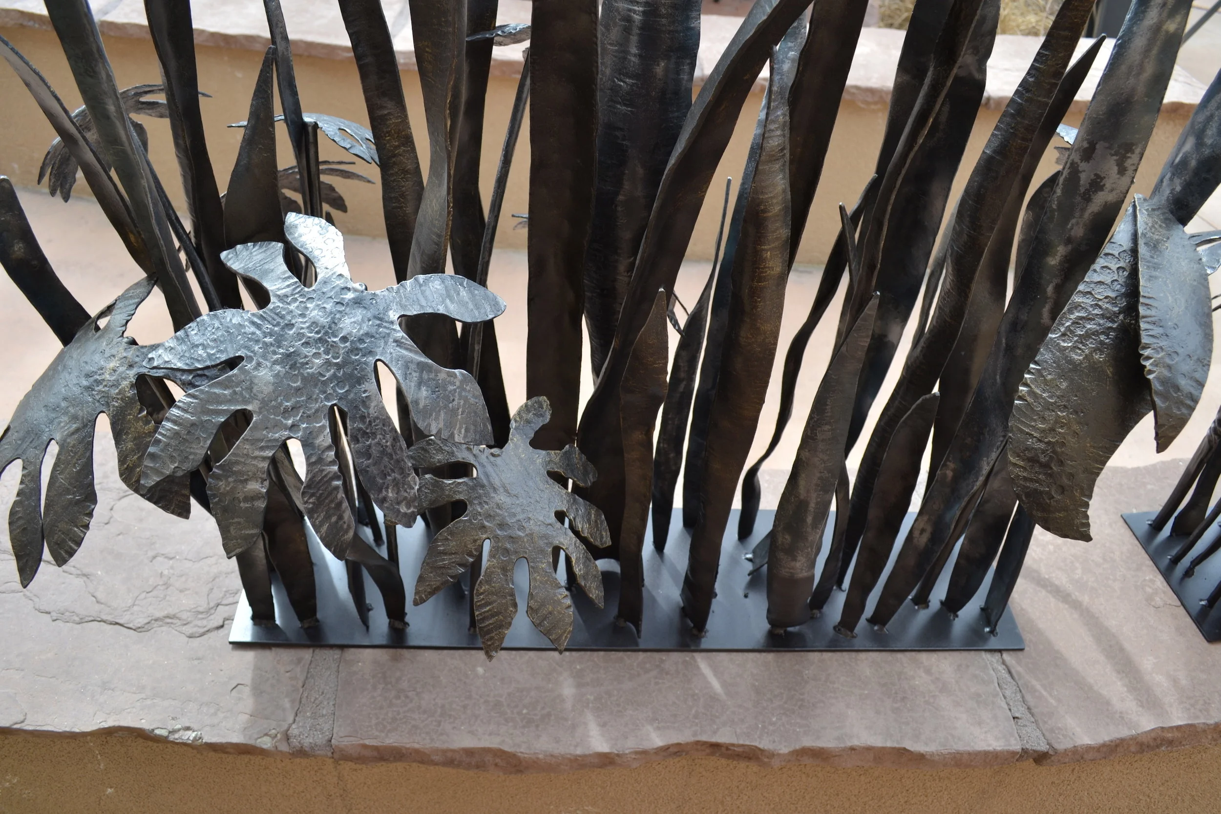 modern wrought-iron style metal and glass art, sculpture, and custom decor