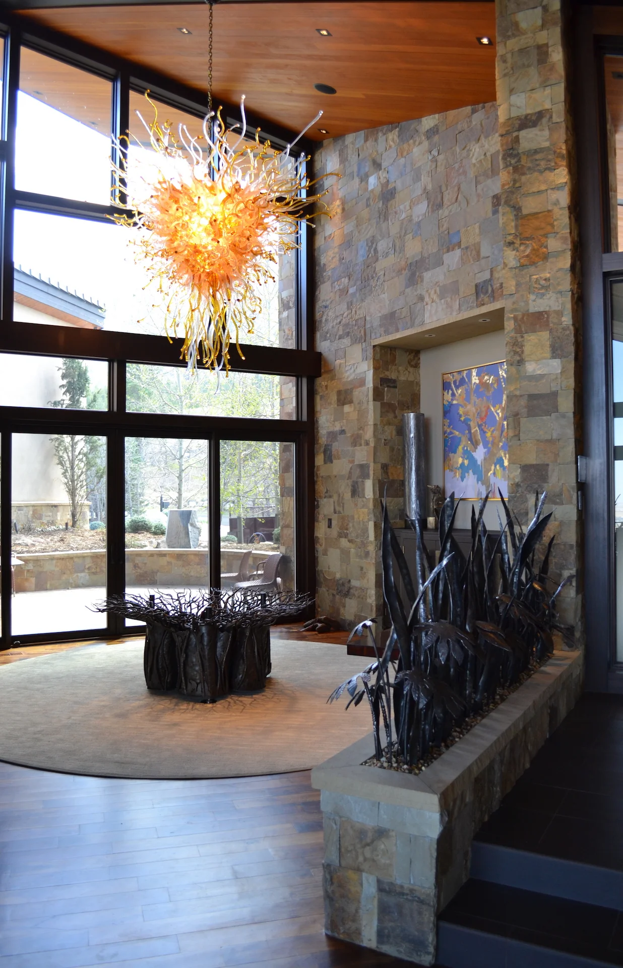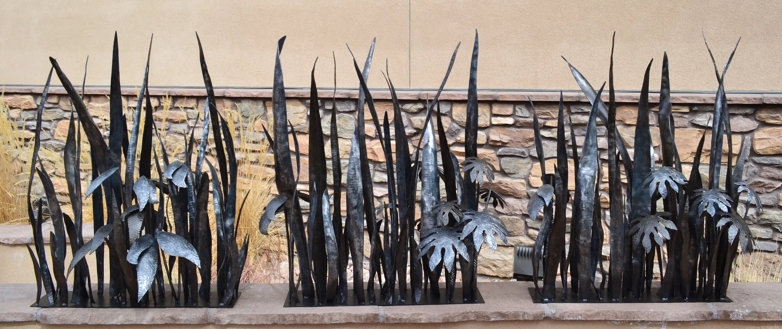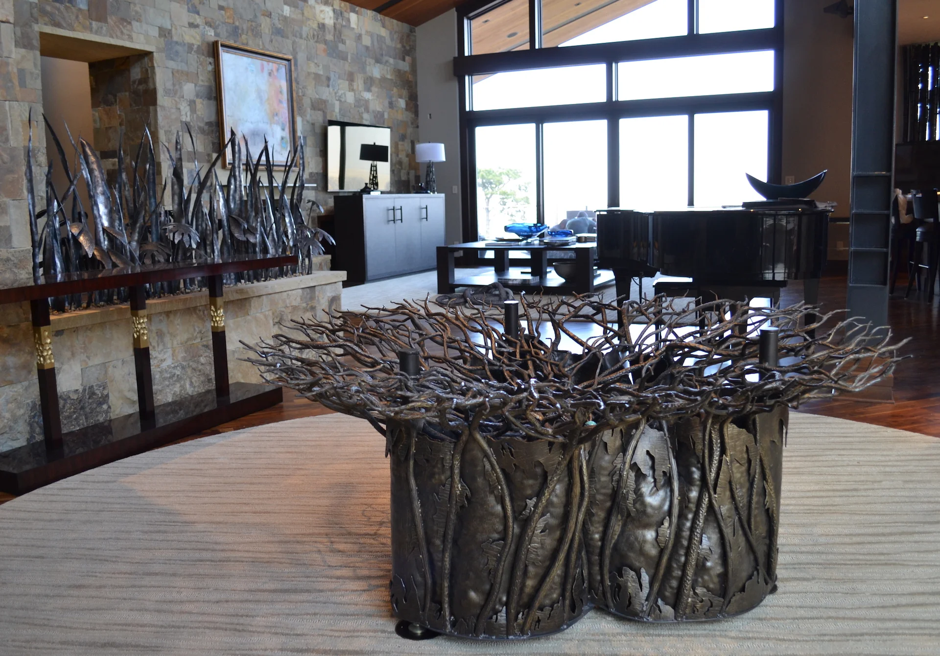 modern wrought-iron style metal and glass art, sculpture, and custom decor
