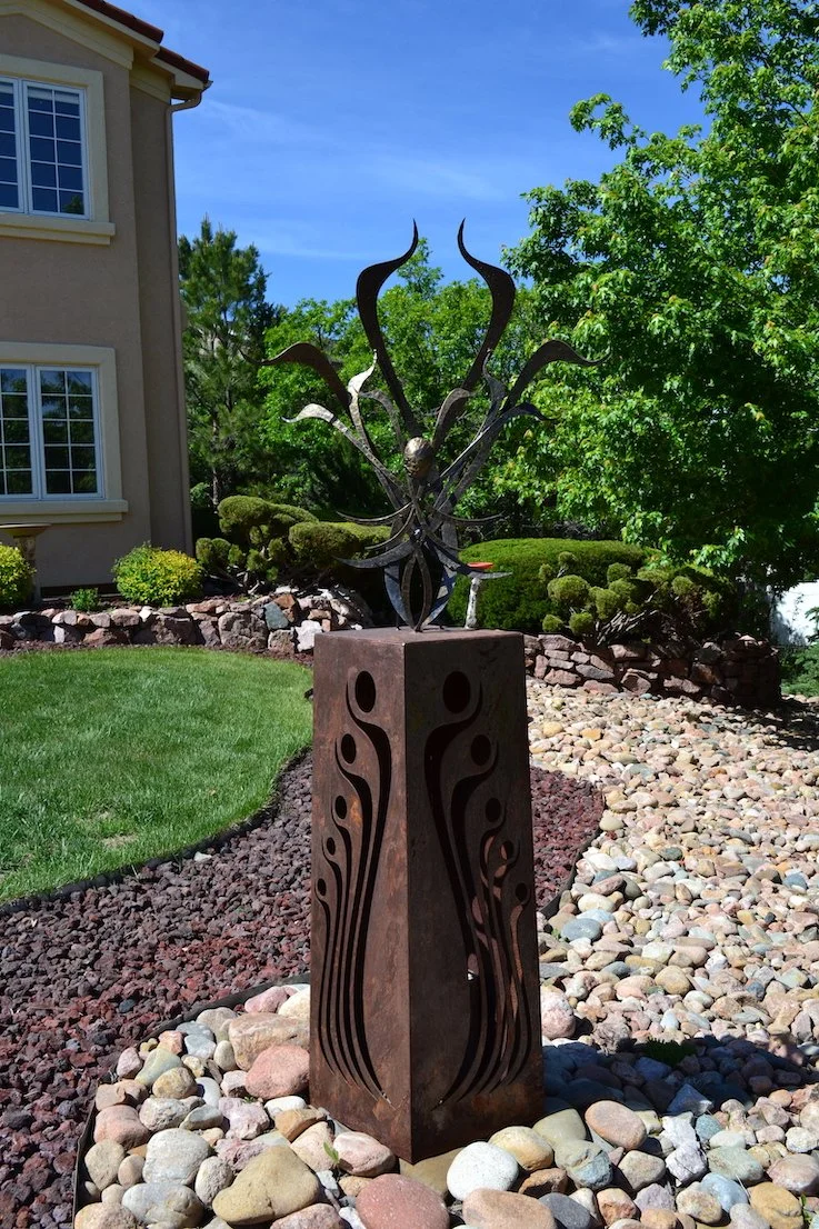 modern wrought-iron style metal and glass art, sculpture, and custom decor