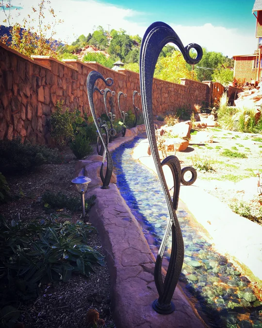 modern wrought-iron style metal and glass art, sculpture, and custom decor